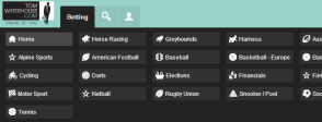 The Tom Waterhouse interface is identical to that employed by Sportingbet, albeit with a different template. Sportingbet had previously followed the lead of its parent William Hill by using a horizontal rather than a vertical menu to display the list of sports. Clicking on the ‘All Sports’ link displays the full list. The sports are sorted using a combination of popularity and alphabetically, which is confusing at first, although we like the fact that the alphabetised sports are listed from left to right rather than top down as with Luxbet.